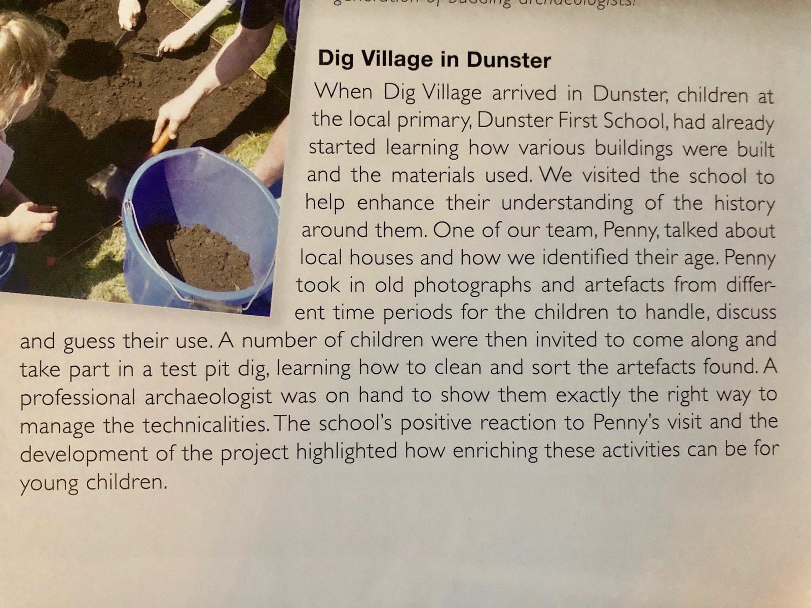 Having been involved with the Time Team Dig Village community archaeology project since 2014, we have experience in the organisation required on a village scale community project. From the booking of hotels, organisation of supplies, communicating with householders and ensuring the correct professionals are on site, this undertaking cannot be underestimated. Education was also part of this project and on several occasions we attended the local school to take lessons with various age groups, which led to some of the children being invited to take part in one of the community digs with us, a session enjoyed by all.